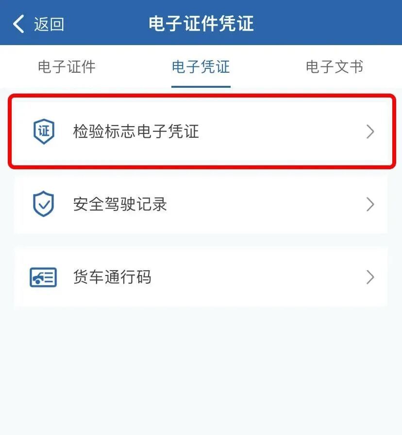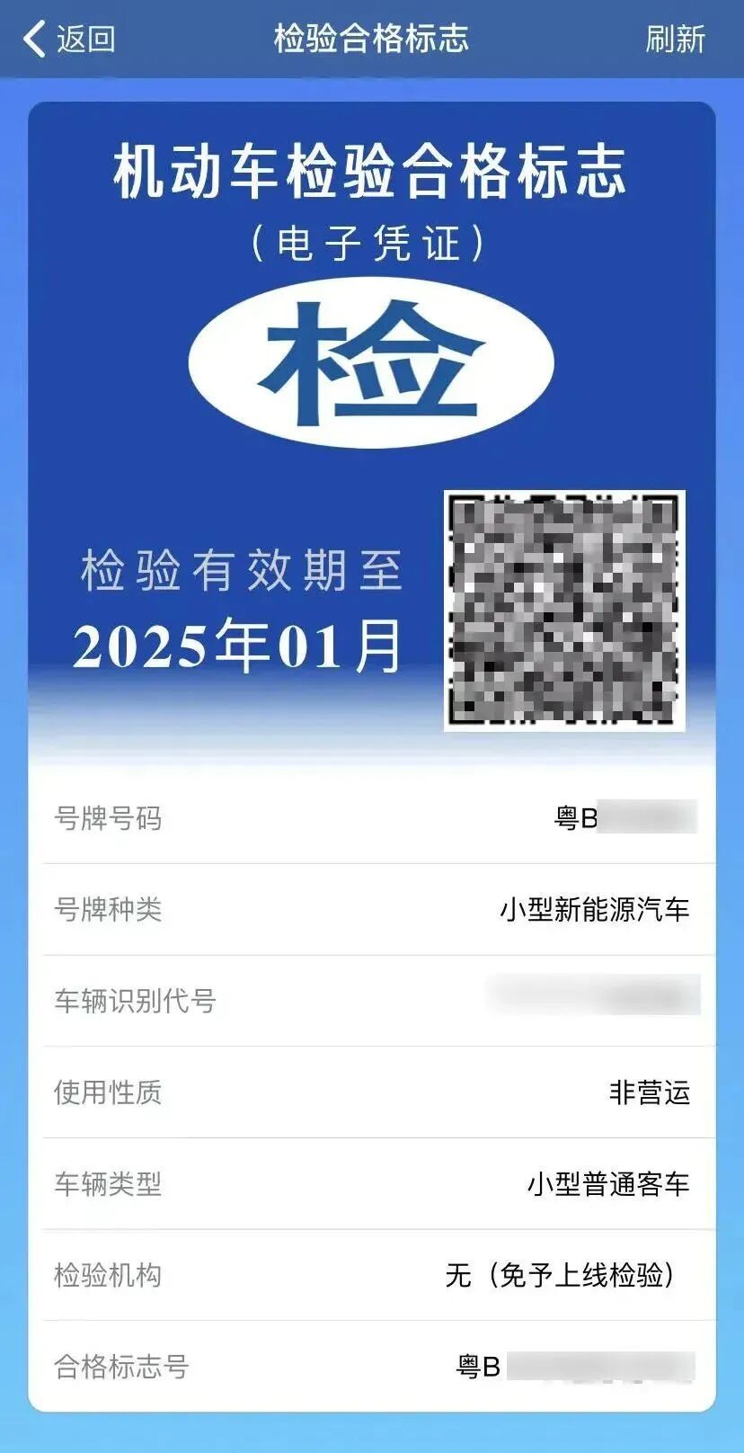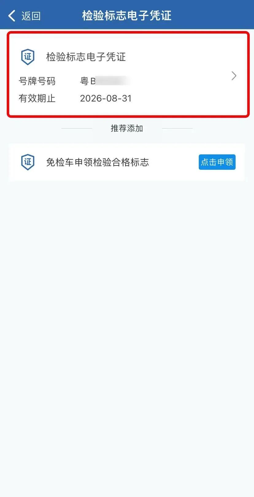 “交管12123”APP→首页上方【电子证件凭证】→电子凭证→检验标志电子凭证(即可查看或出示)。