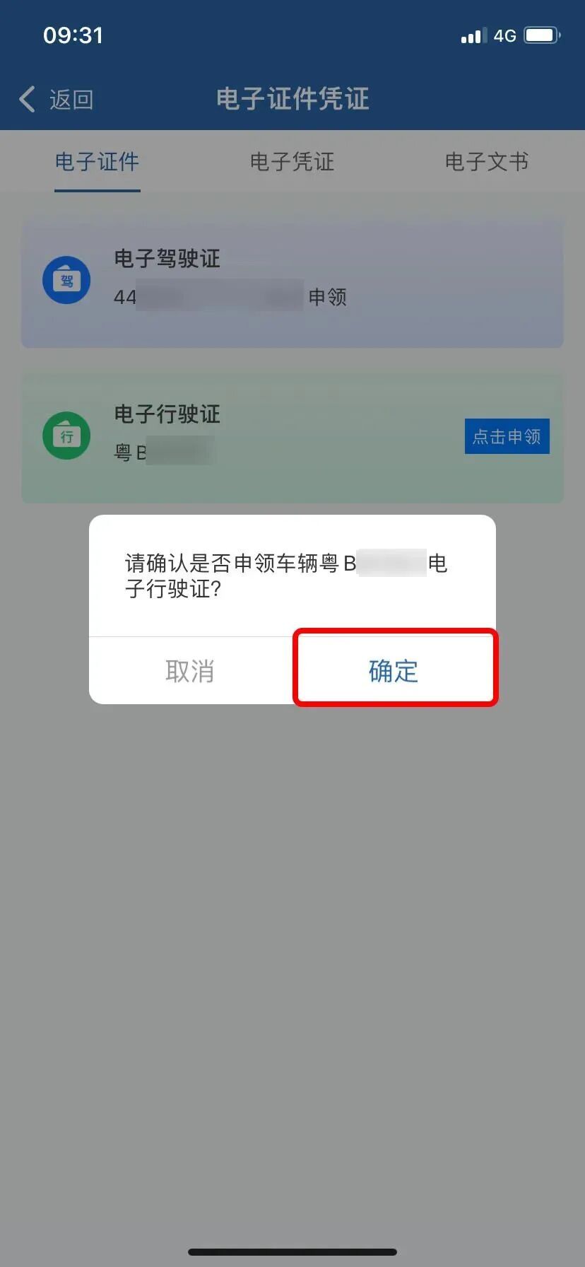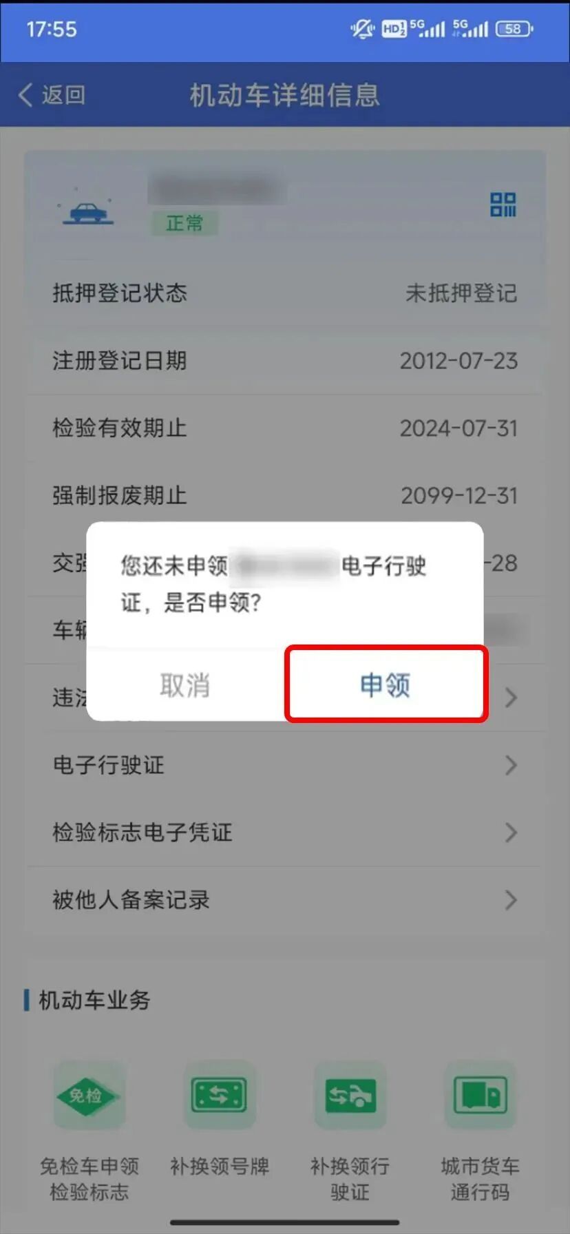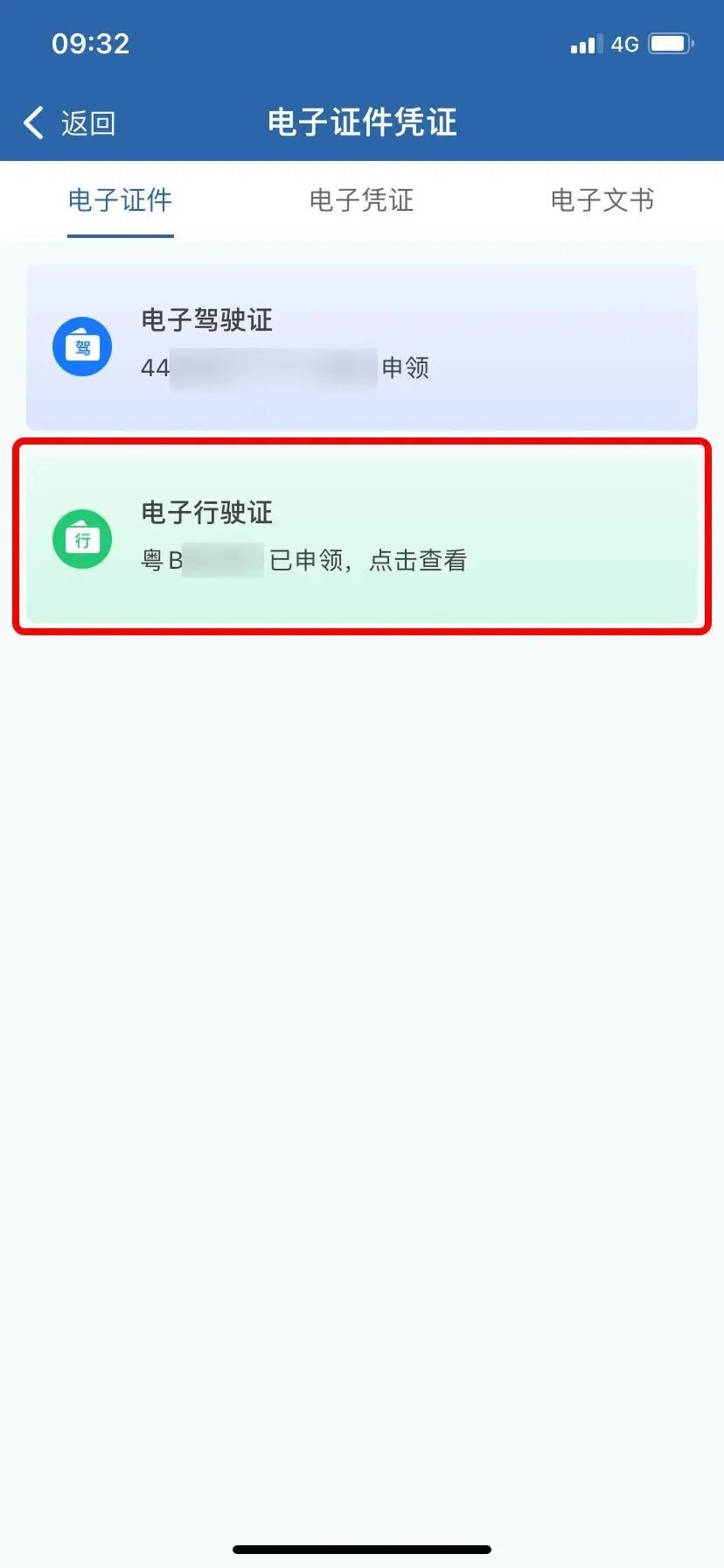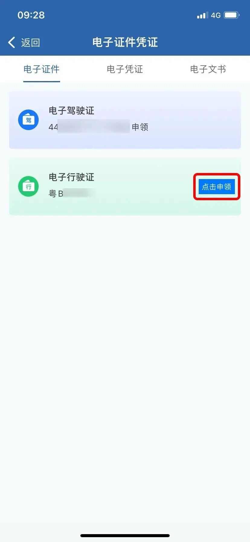 “交管12123”APP→首页上方【电子证件凭证】→自主选择机动车点击电子行驶证右侧的【申领】按钮进行申领→系统核对通过即为完成申领。