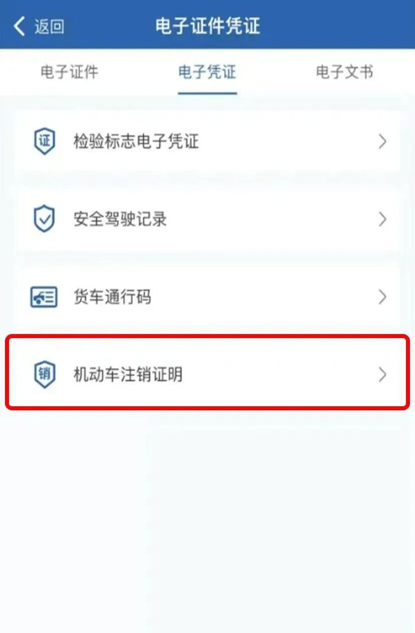 “交管12123”手机APP→首页上方【电子证件凭证】→点击“电子凭证”中的【机动车注销证明】→点击页面“右上角”的下载图标→下载“机动车注销证明书”电子版→下载成功。